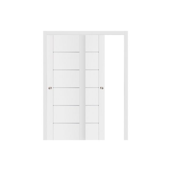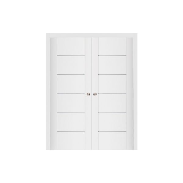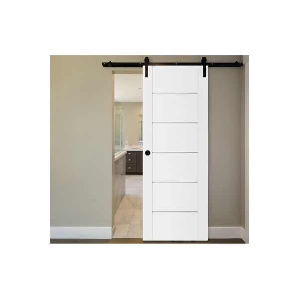 Slim vertical frames define the edges of the door designs, creating a central canvas for geometric innovation. Horizontal framing and skinny metal accent lines stand out and create subtly shadowed shapes on the surface of the door. The layered, solid interior doors are made out of MDF and weigh around 60 pounds. Enjoy a high-quality feel and gliding swing.
